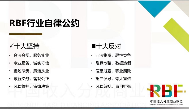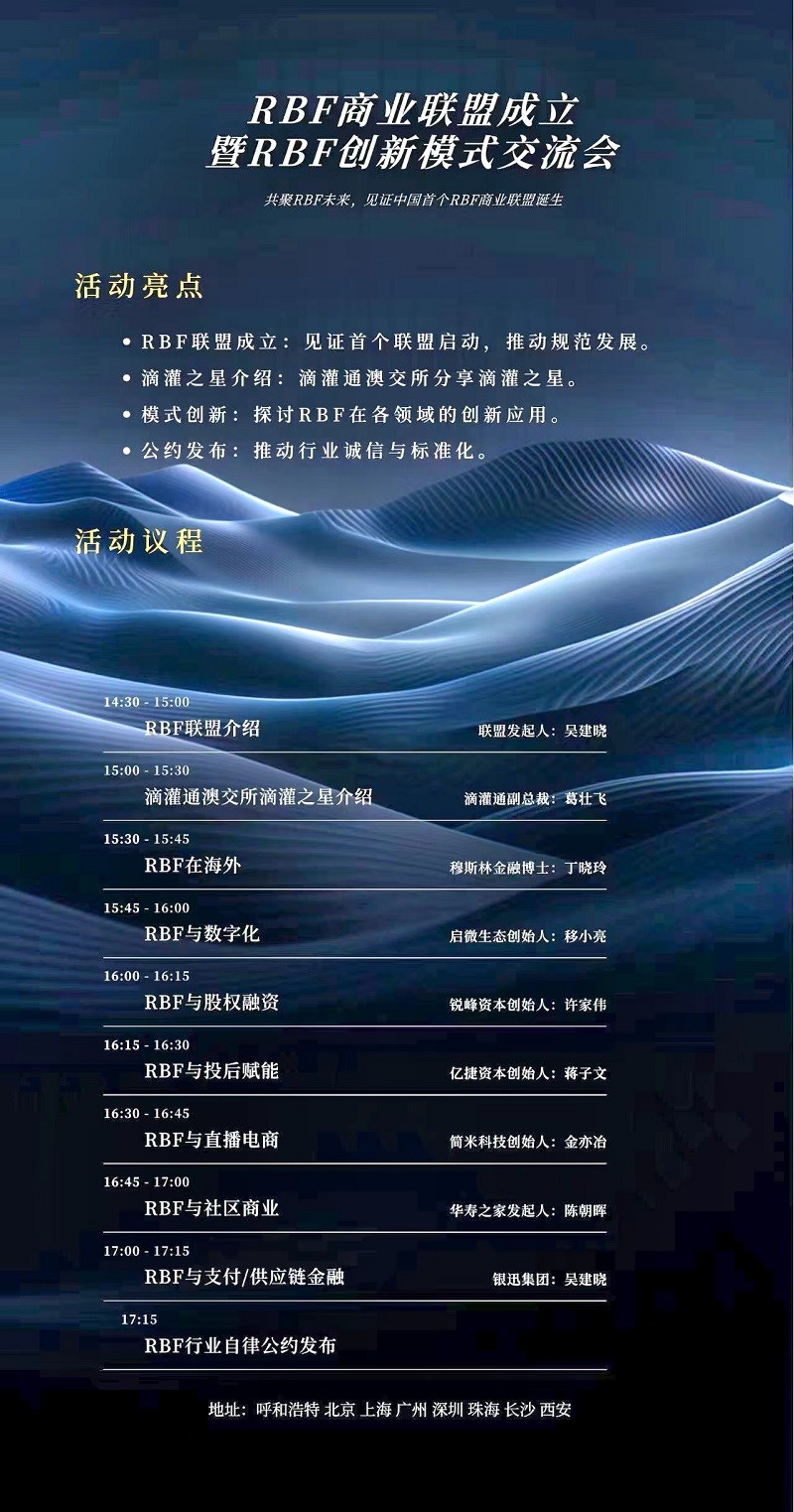 活動議程首先由RBF聯盟發起人吳建曉介紹:中國收入分成商業聯盟成立由來;滴灌通副總裁葛壯飛介紹:滴灌通澳交所滴灌之星系統;穆斯林金融博士丁曉玲解讀:RBF在海外;啟微生態創始人移小亮分享:RBF與數字化;銳峰資本創始人許家偉專題介紹:RBF與股權融資;億捷資本創始人蔣子文解讀:RBF與投后賦能;簡米科技創始人:金亦冶介紹:RBF與直播電商;華壽之家發起人陳朝暉解讀:RBF與社區商業;銀迅集團運營總經理吳建曉分享:RBF與支付/供應鏈金融;大會還對未來的RBF行業自律公約進行發布。